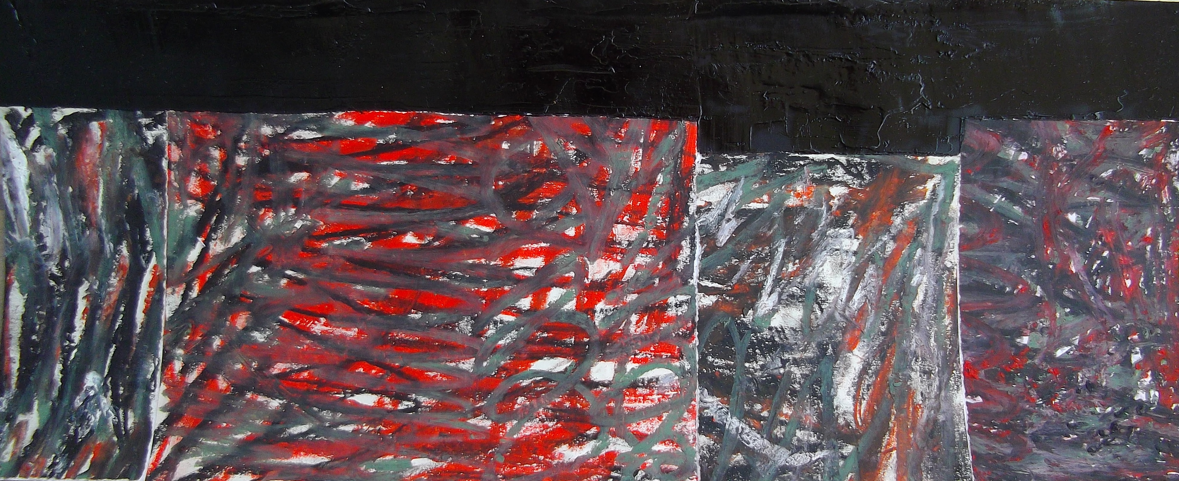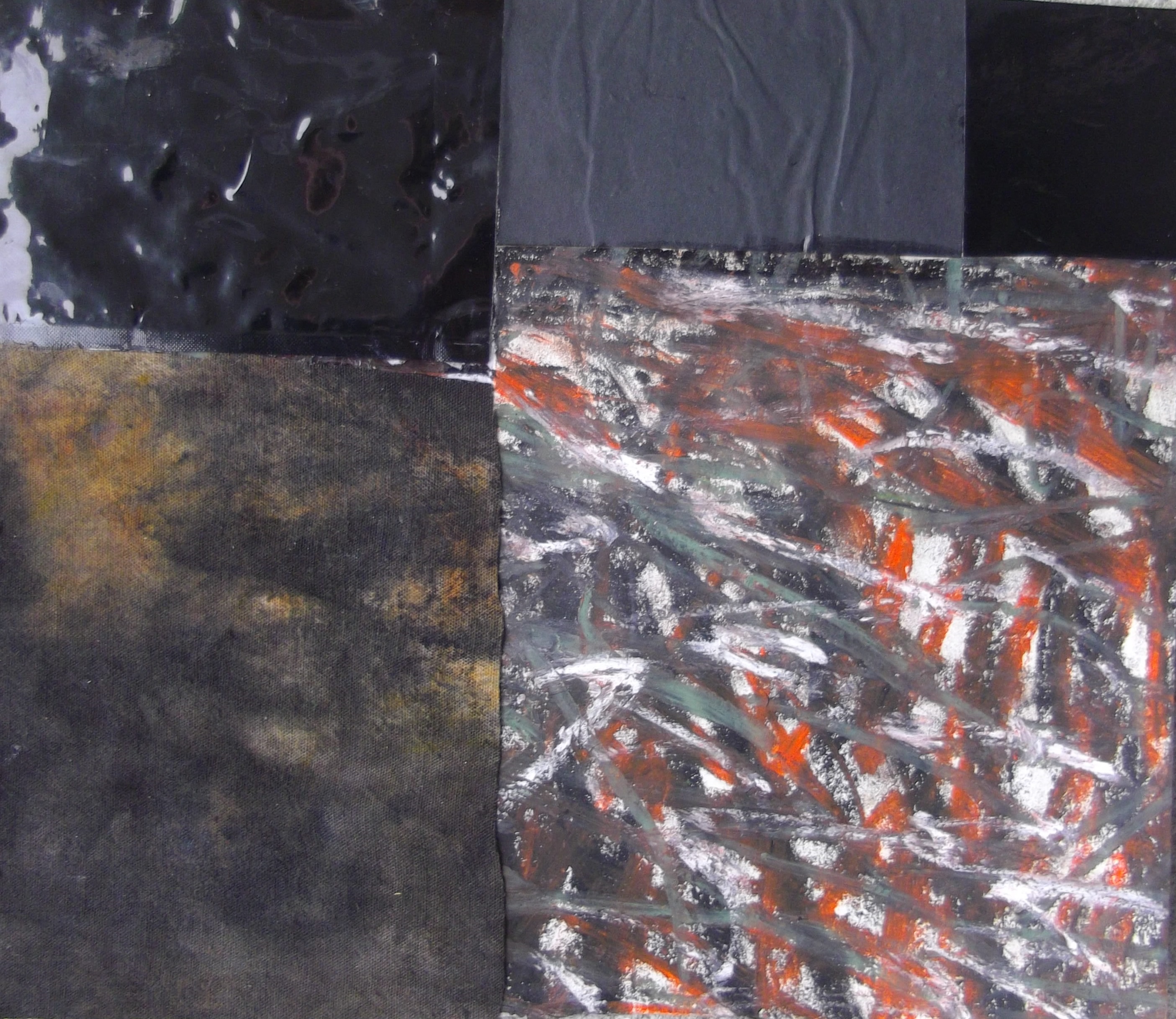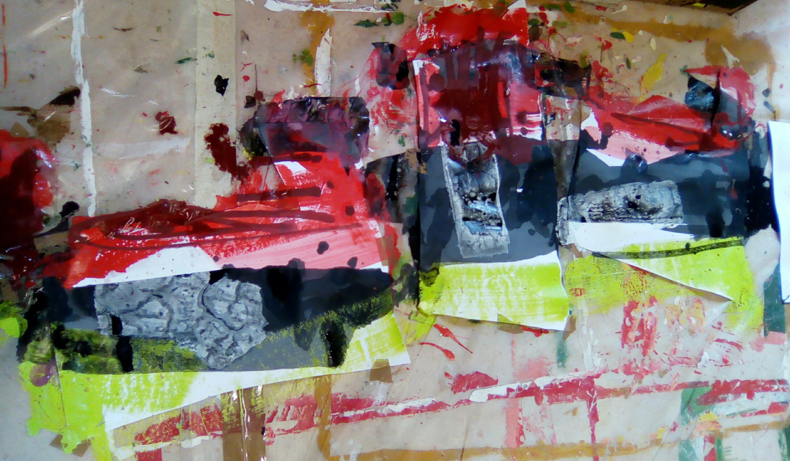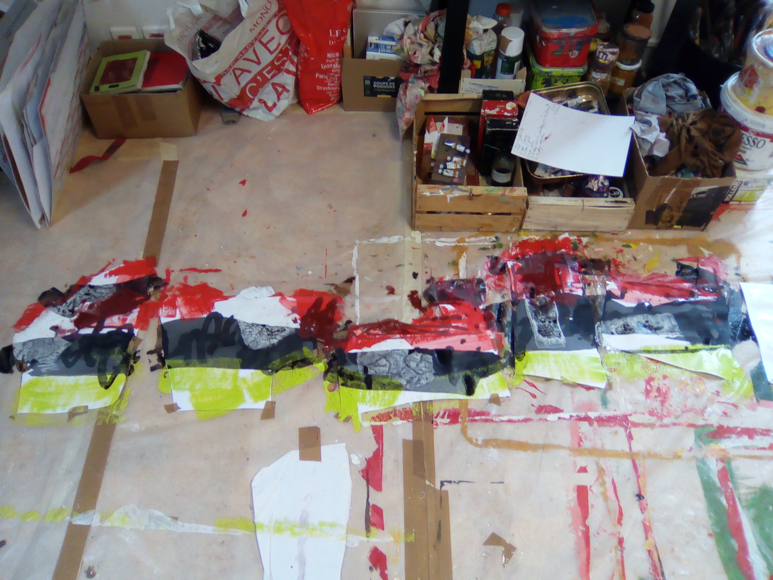 Les séries chaussure-maison et peintures cloutées sont des peintures sur papier. Chaos d'architectures, ils abritent des énergies vives, des ombres inattendues, des flaques, des taches, des poudres, des fluides, des cales et des tiroirs en forme de pochoir. Vert et rouge. Blanc et noir. C'est le jour et la nuit des épaisseurs. Livret ateliers portes ouvertes.
